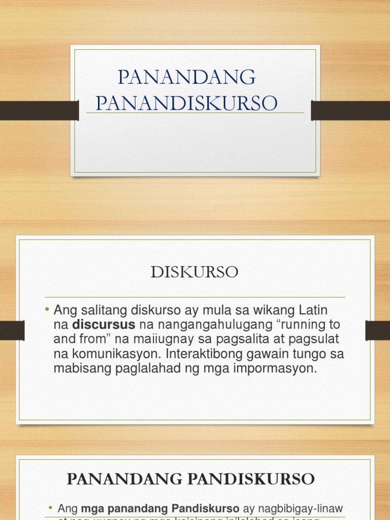 Descriptive Narrative Argumentative Persuasive atbp. Sagot PANANDANG PANDISKURSO Sa paksang ito ating aalamin kung ano nga ba ang mga halimbawa ng panandang pandiskurso at ang kahulugan nito. Ito ay ang mga yunit ng linggwistik na binubuo ng ibat ibang pangungusap- sa ibang salita ay salisalitaan conversation argumento o pananalita speeches.
