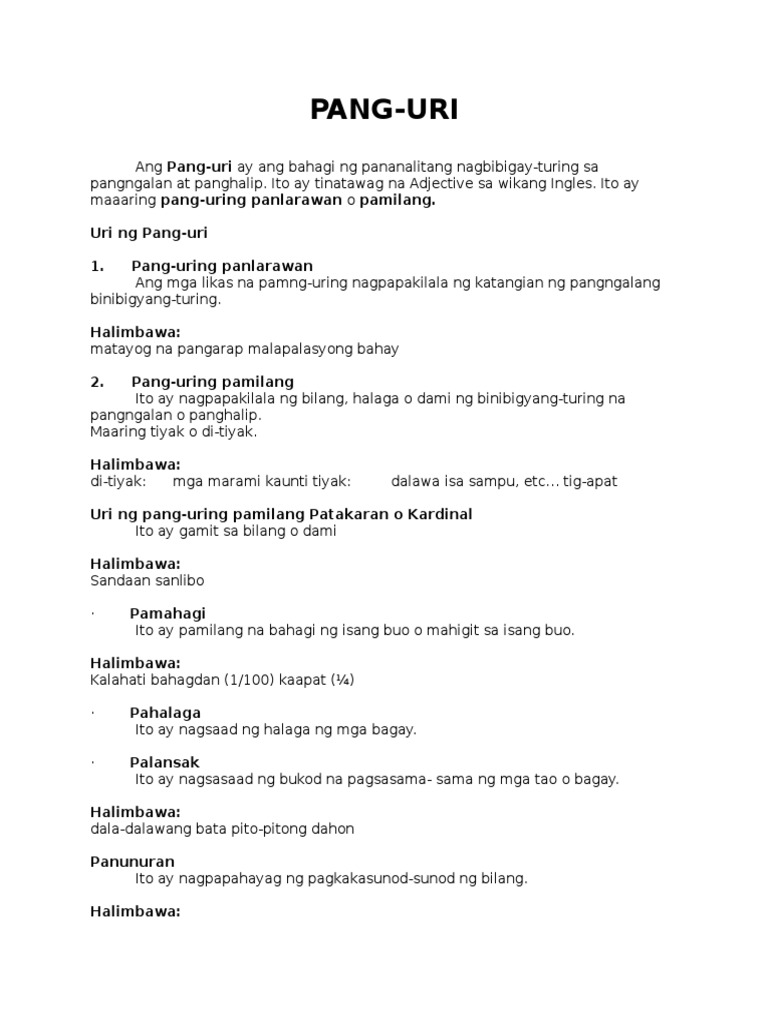 This 20-item worksheet asks the student to classify the underlined adjective in the sentence as a descriptive adjective pang-uring panlarawan a cardinal adjective pang-uring pamilang or as an ordinal. ALantay Walang tinutukoy kundi ang katangian ng pangngalang nilalarawan. Kabilang ang pang-uri sa mga Bahagi ng Pananalita o Parts of Speech.