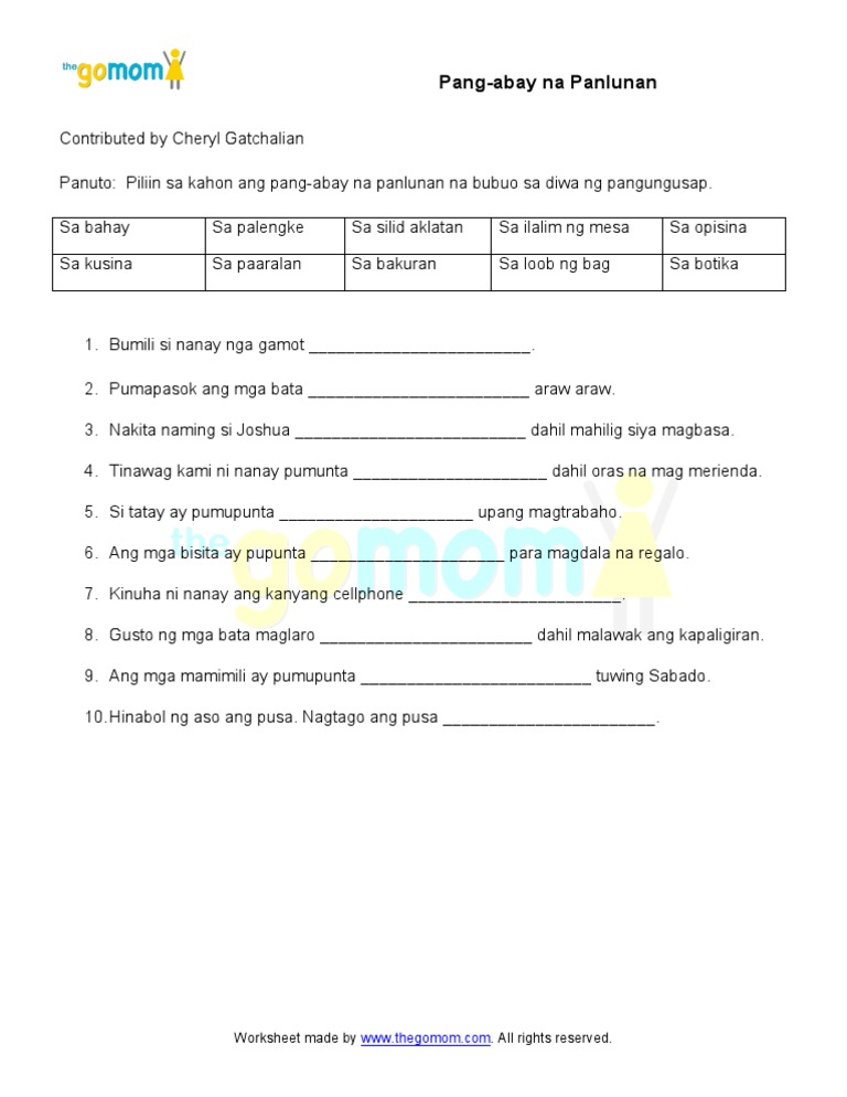 Ang Pang-abay na Panlunan ay nagsasaad ay tumutukoy sa pook kung saan naganap ang kilos o pangyayari. This 20-item worksheet asks the student to classify the underlined adverb or adverb phrase as an adverb of manner pang-abay na pamaraan adverb of time pang-abay na pamanahon or an adverb of place pang-abay na panlunan. Sa ginagamit kapag ang kasunod ay isang pangngalang pambalana o isang panghalip.
