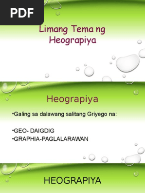 LIMANG TEMA NG HEOGRAPIYA Sa paksang ito alamin nating ang limang tema ng heograpiya at ang kahulugan ng bawat isa. Get 17 pages limang tema ng heograpiya ng pilipinas solution in PDF format. Save limang tema ng heograpiyappt For Later.